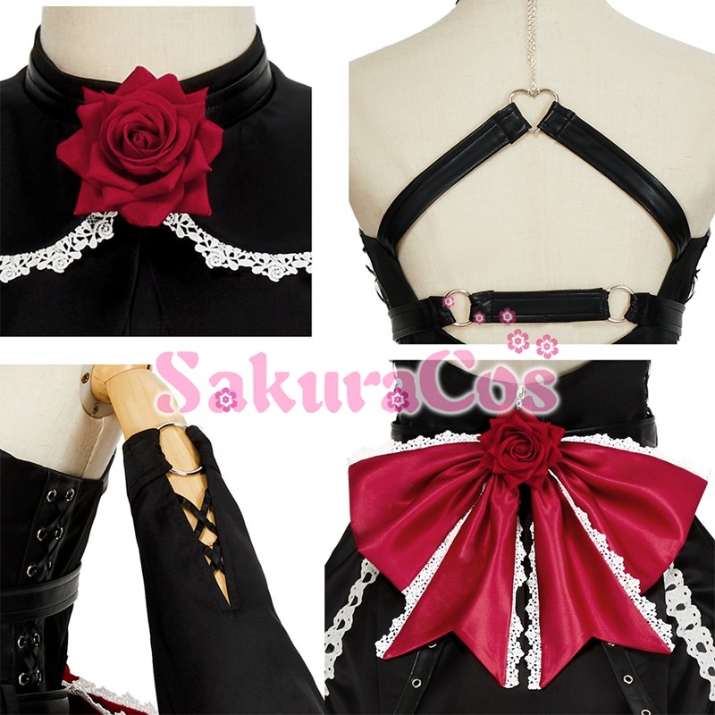 ◆ セット:上着、スカート、マント、袖、ベルト(腰)、蝶結び(背後)、髪飾り、バラの花、手袋、太もも飾り、ベルト*4